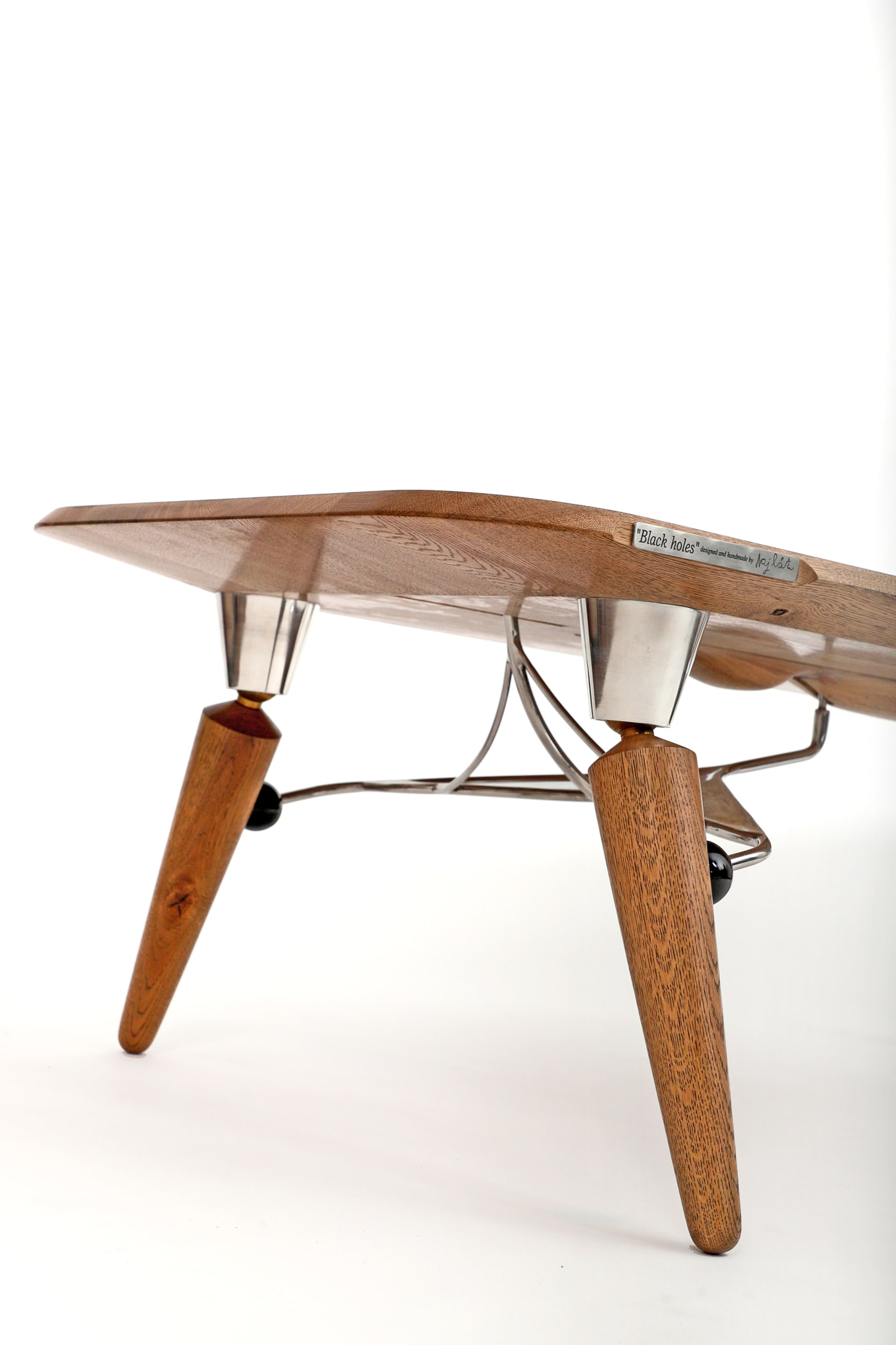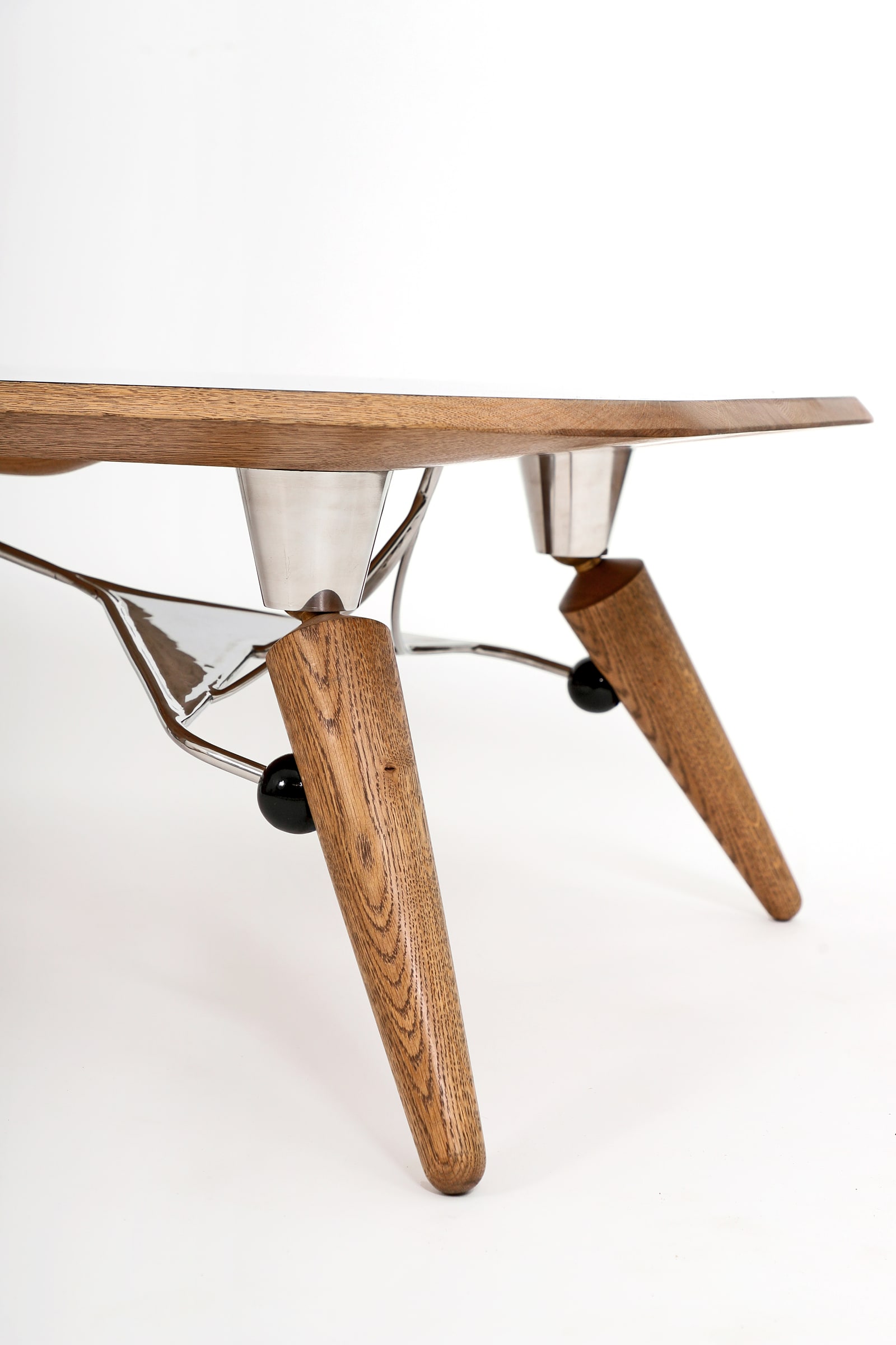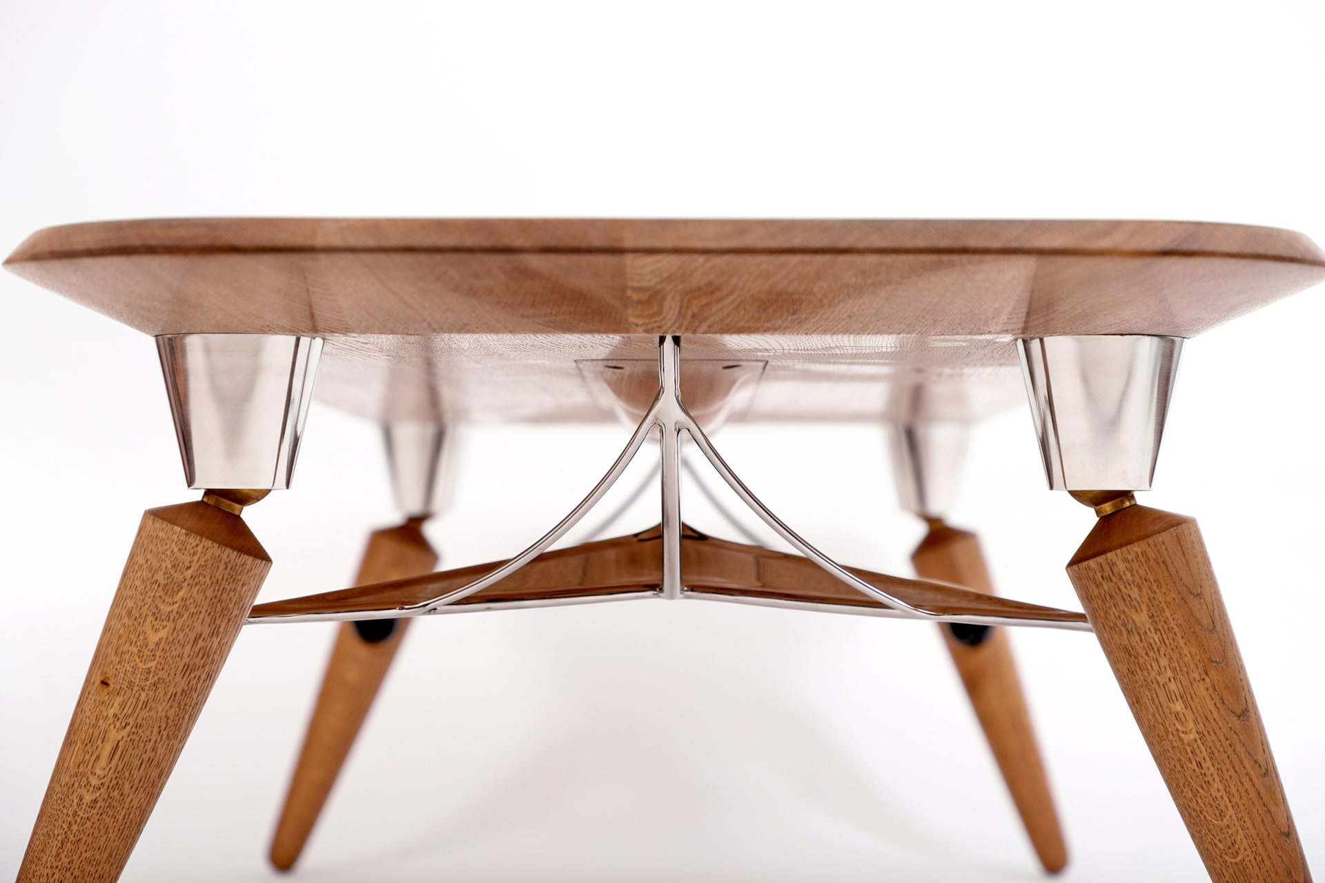 Stolík sa vyznačuje možnosťou nastavenia výšky dosky naklápaním nožičiek pomocou mechanizmu so stredovým súdkom. Samotná doska spolu s nožičkami a stredovým súdkom sú tvorené z dubového dreva. Ostatné komponenty mechanizmu sú z antikorovej ocele, hliníka, mosadze a bronzu. Na doske stola je vytvorený ornament z polyuretánovej farby pre zabezpečenie trvácnosti a oteruvzdornosti úžitkovej plochy. Všetky komponenty sú navrhnuté a vyrobené špecificky pre daný stolík.