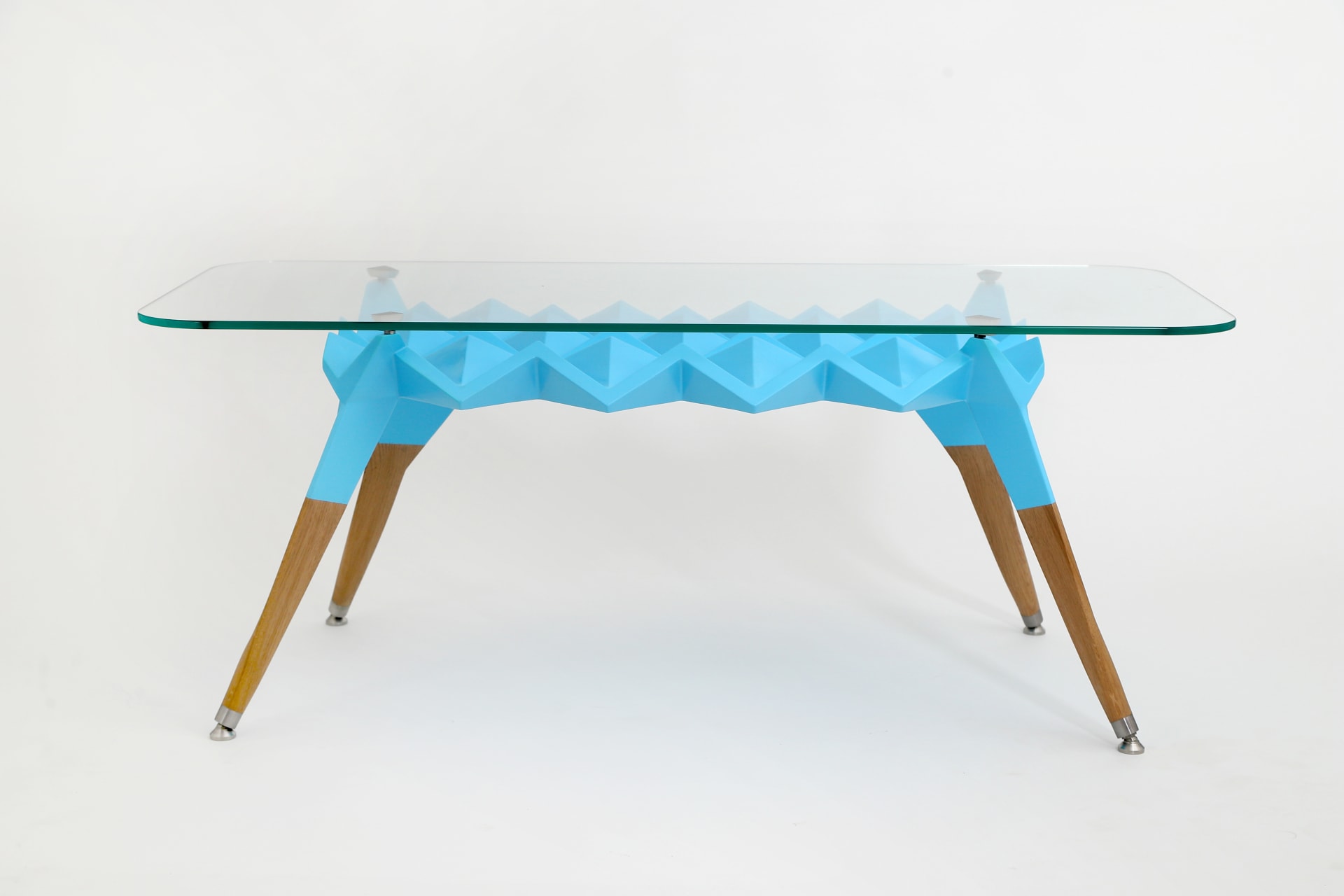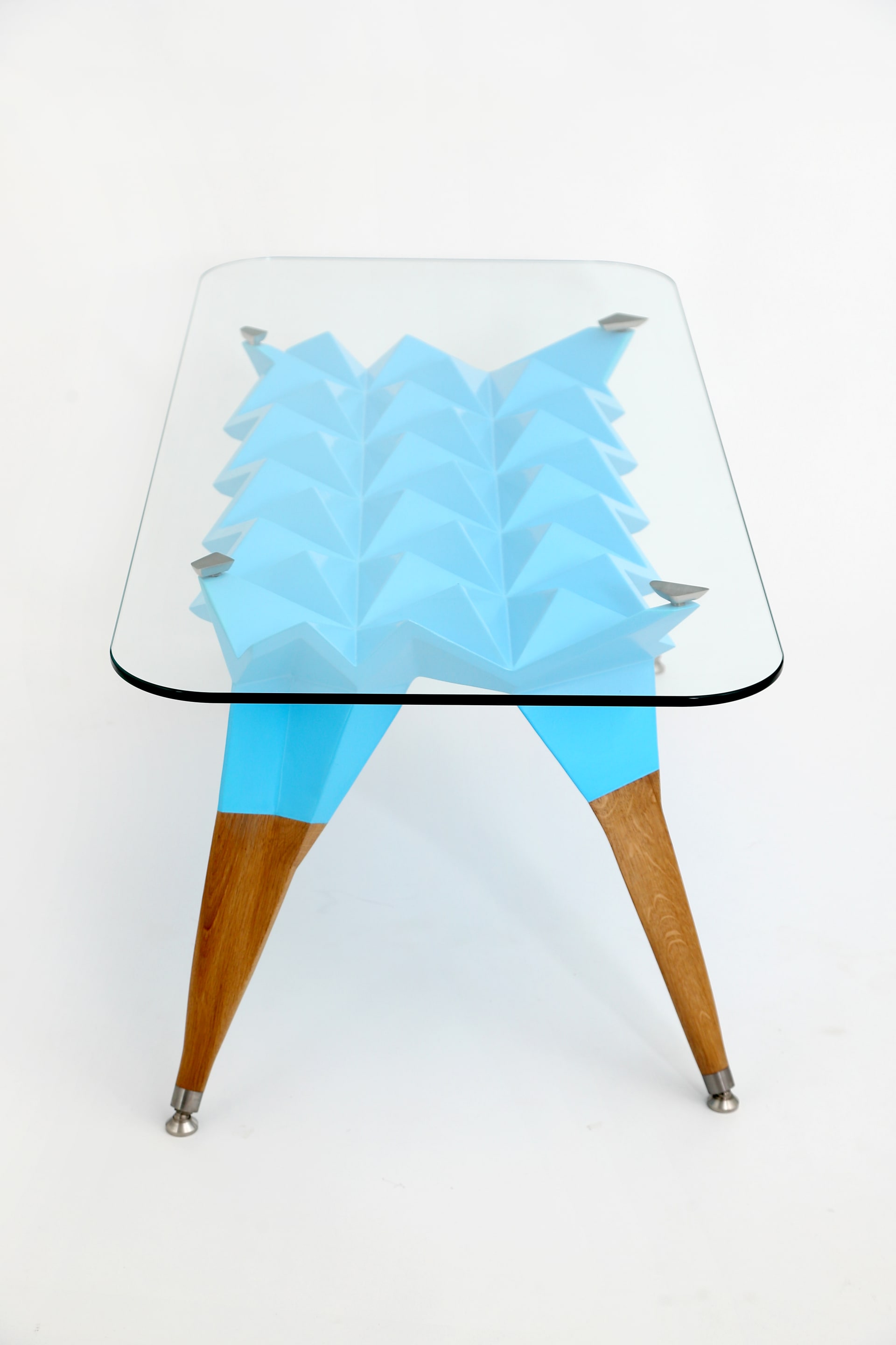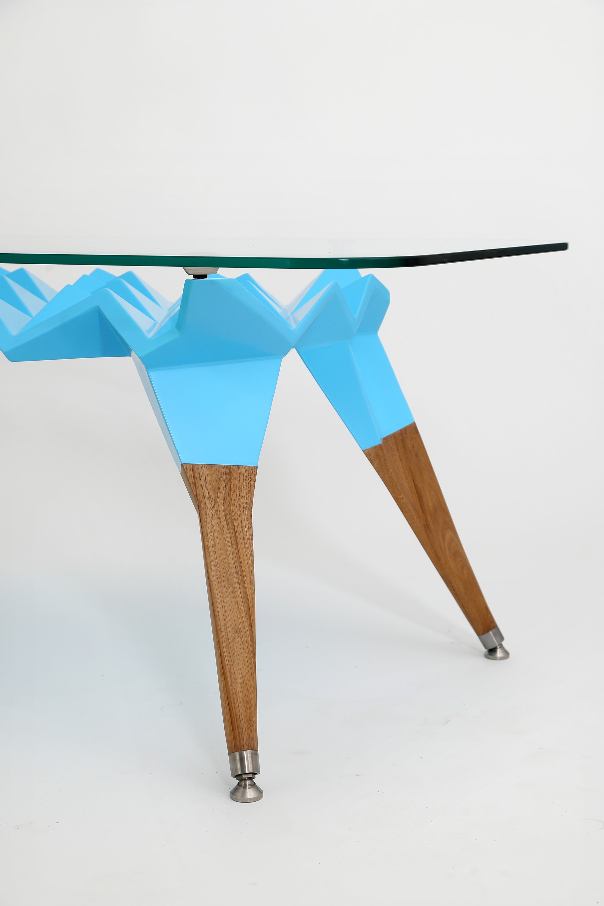 Korpus stolíka je tvorený z geometrických, prevažne trojuholníkových tvarov v spojení s nohami zo starého dubového dreva. Doska je z kaleného skla a ostatné doplňujúce prvky ako nastaviteľné nožičky, sú z antikorovej ocele.