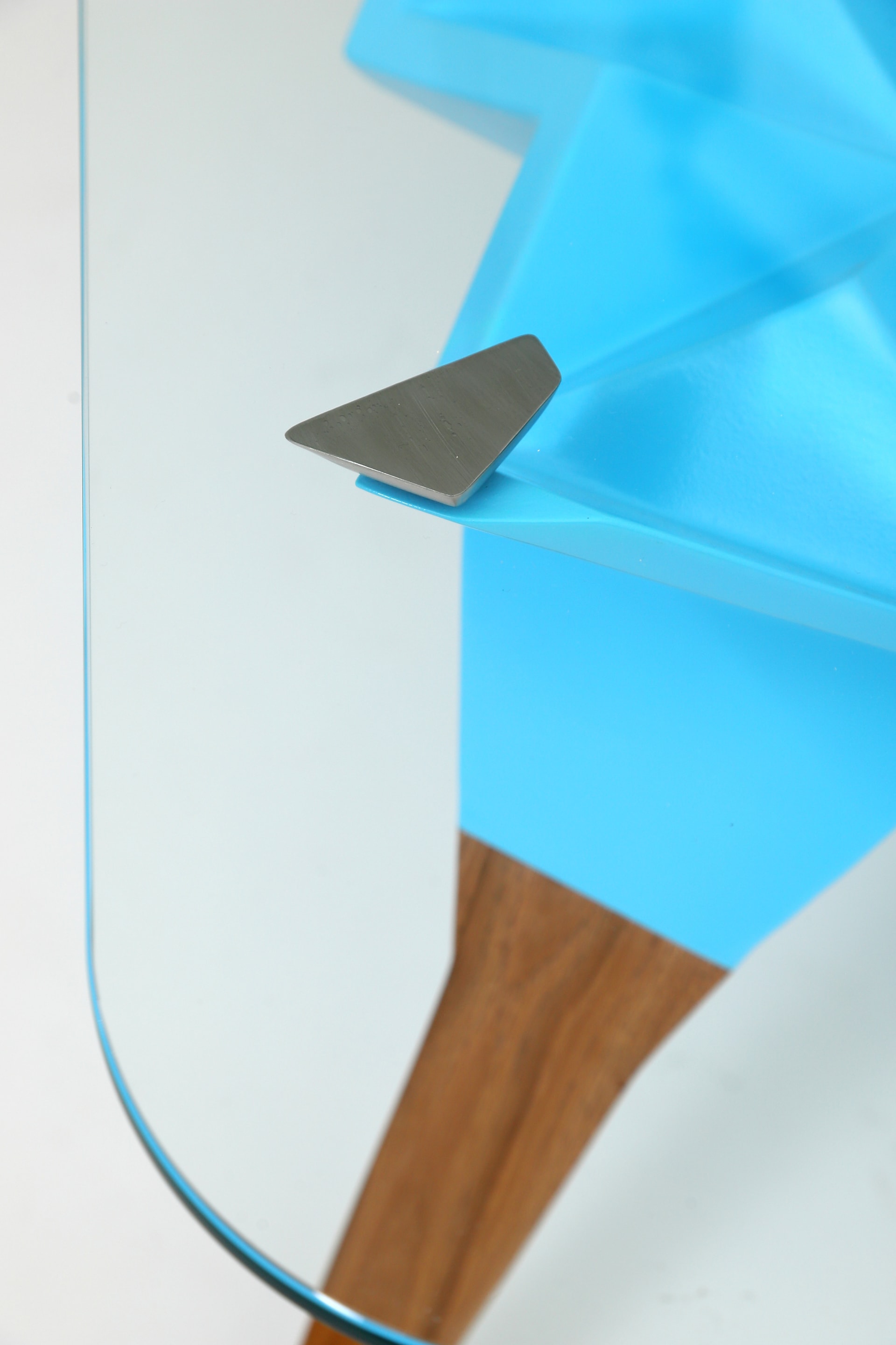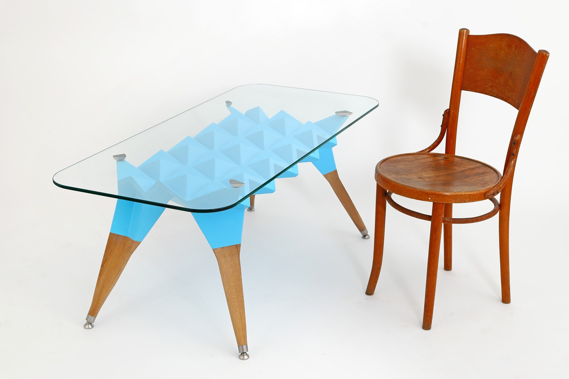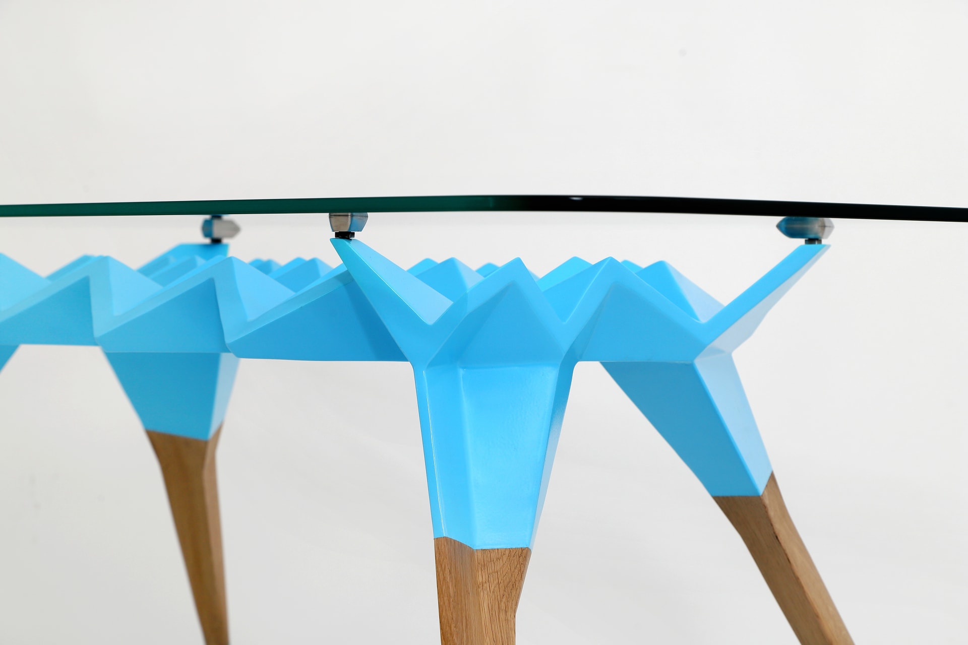 Korpus stolíka je tvorený z geometrických, prevažne trojuholníkových tvarov v spojení s nohami zo starého dubového dreva. Doska je z kaleného skla a ostatné doplňujúce prvky ako nastaviteľné nožičky, sú z antikorovej ocele.