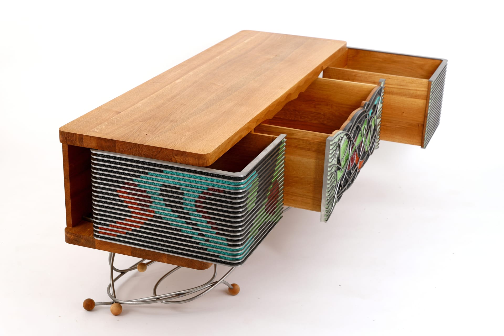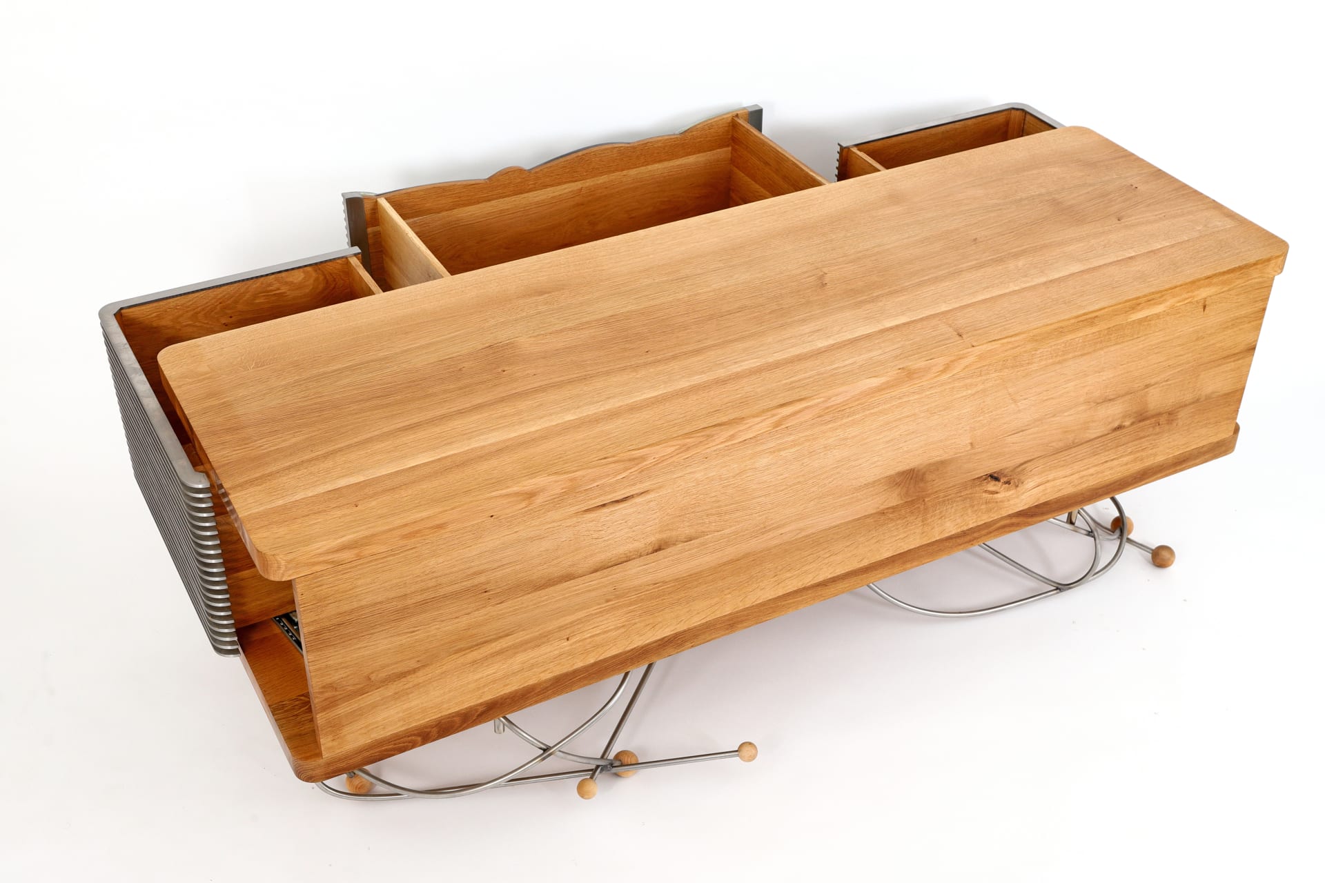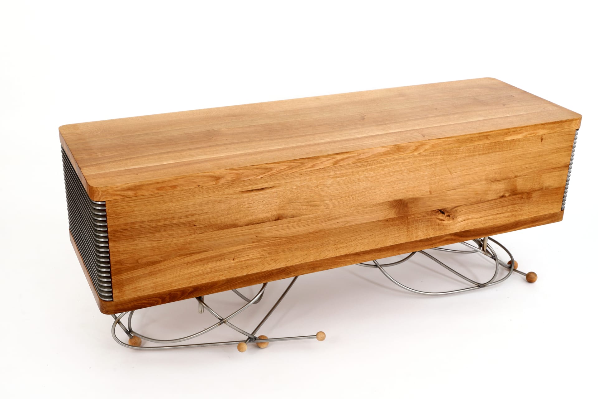 Skrinka z masívneho dubového dreva, antikorovej ocele a kremičitého prášku ( kremenit ).