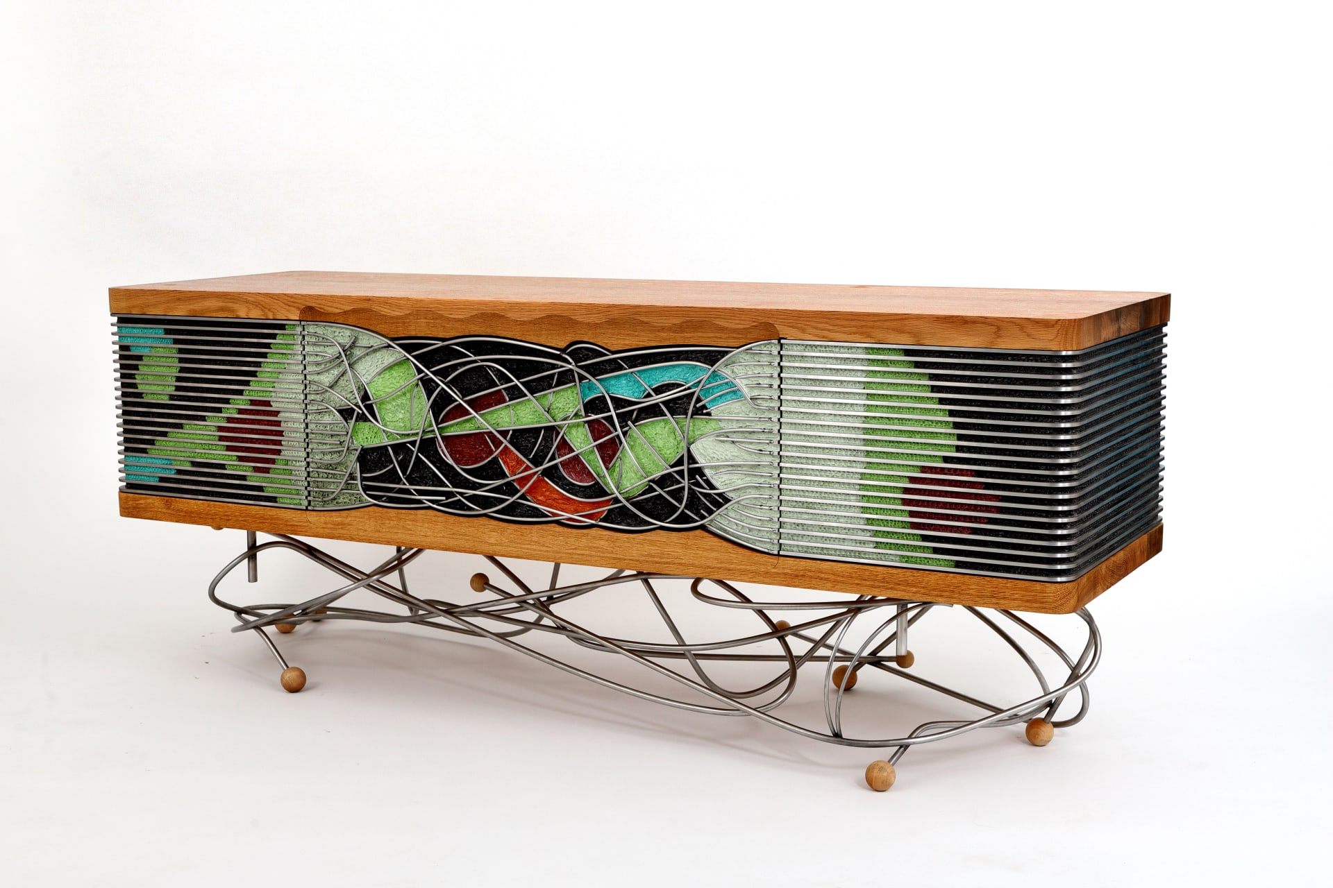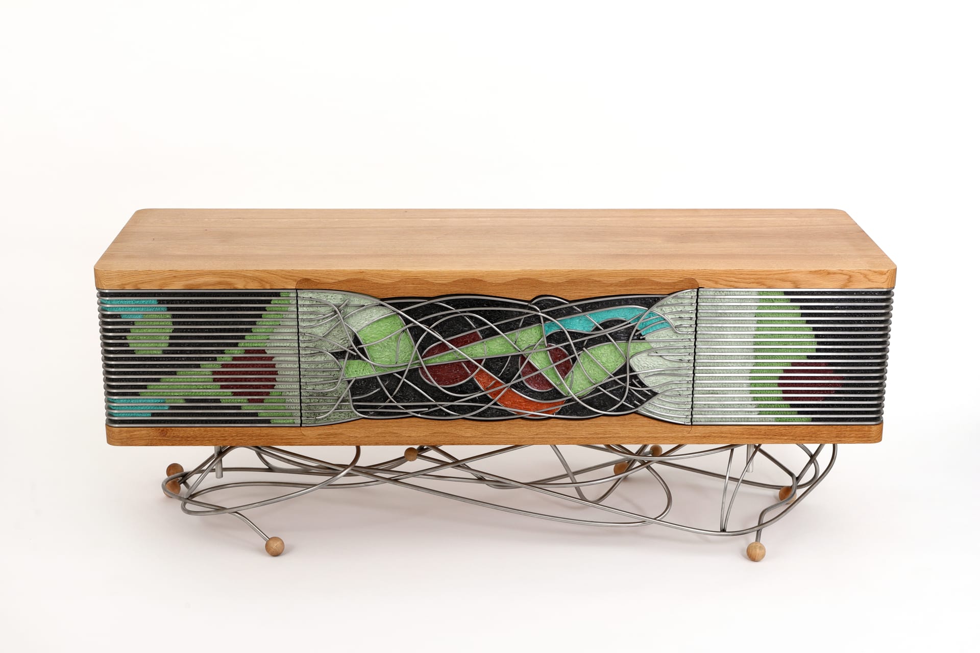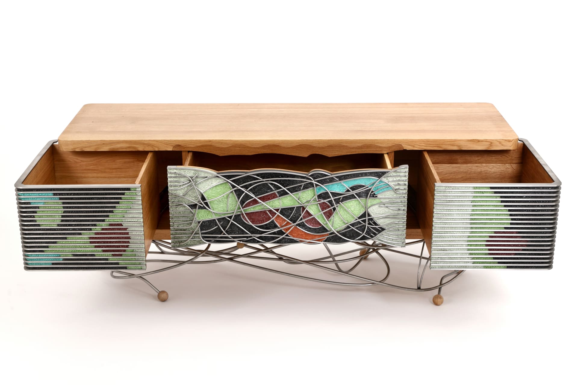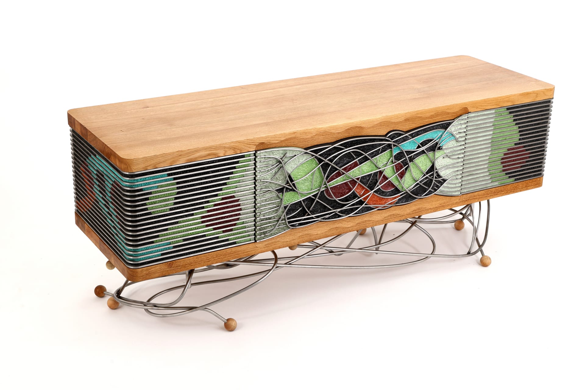Skrinka z masívneho dubového dreva, antikorovej ocele a kremičitého prášku ( kremenit ).