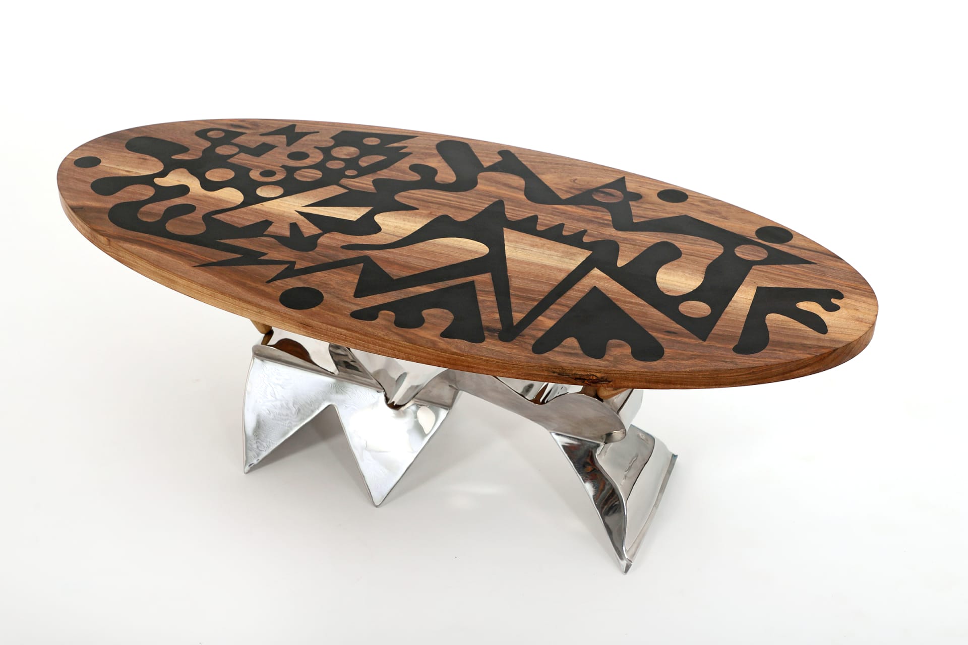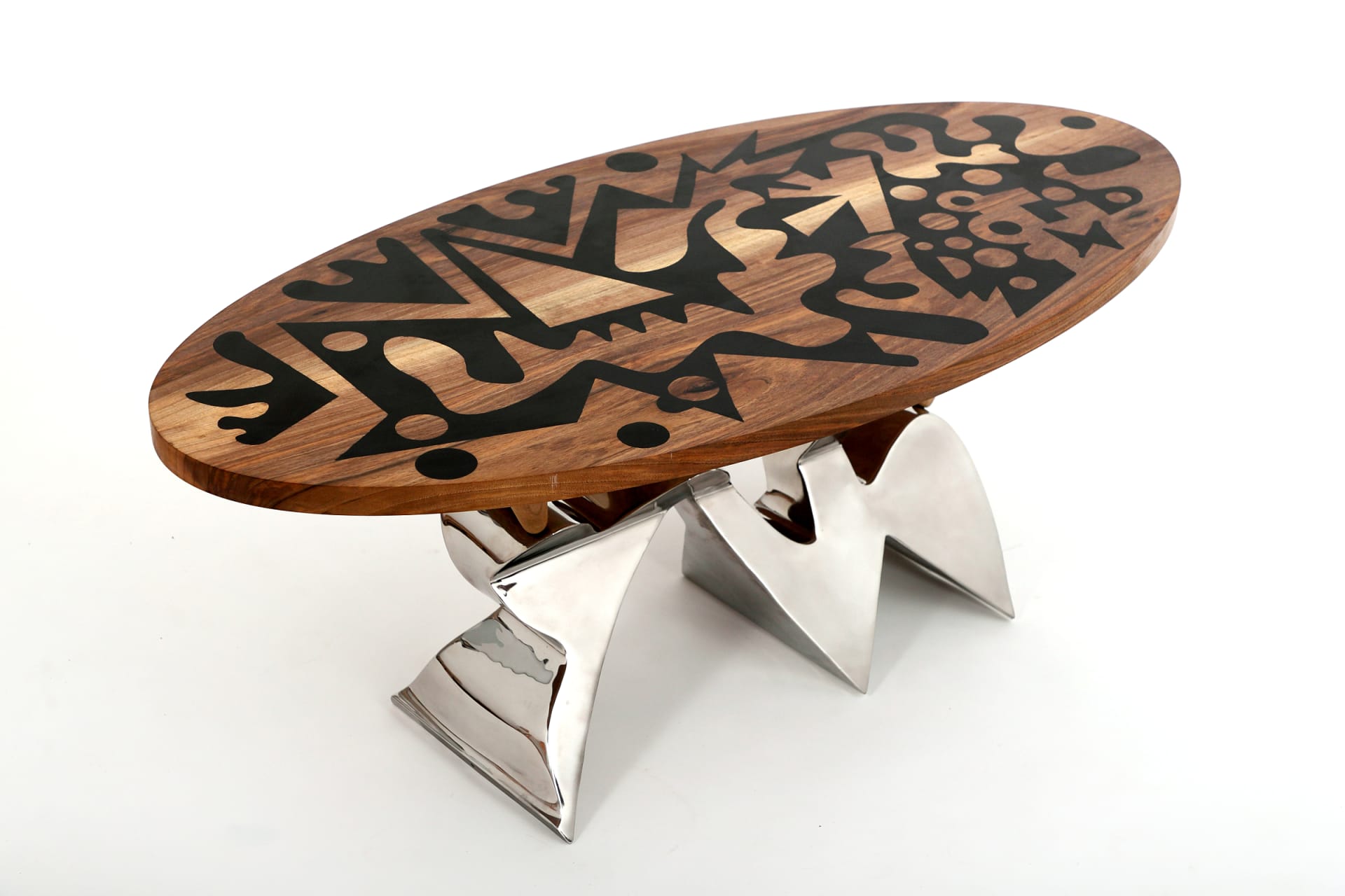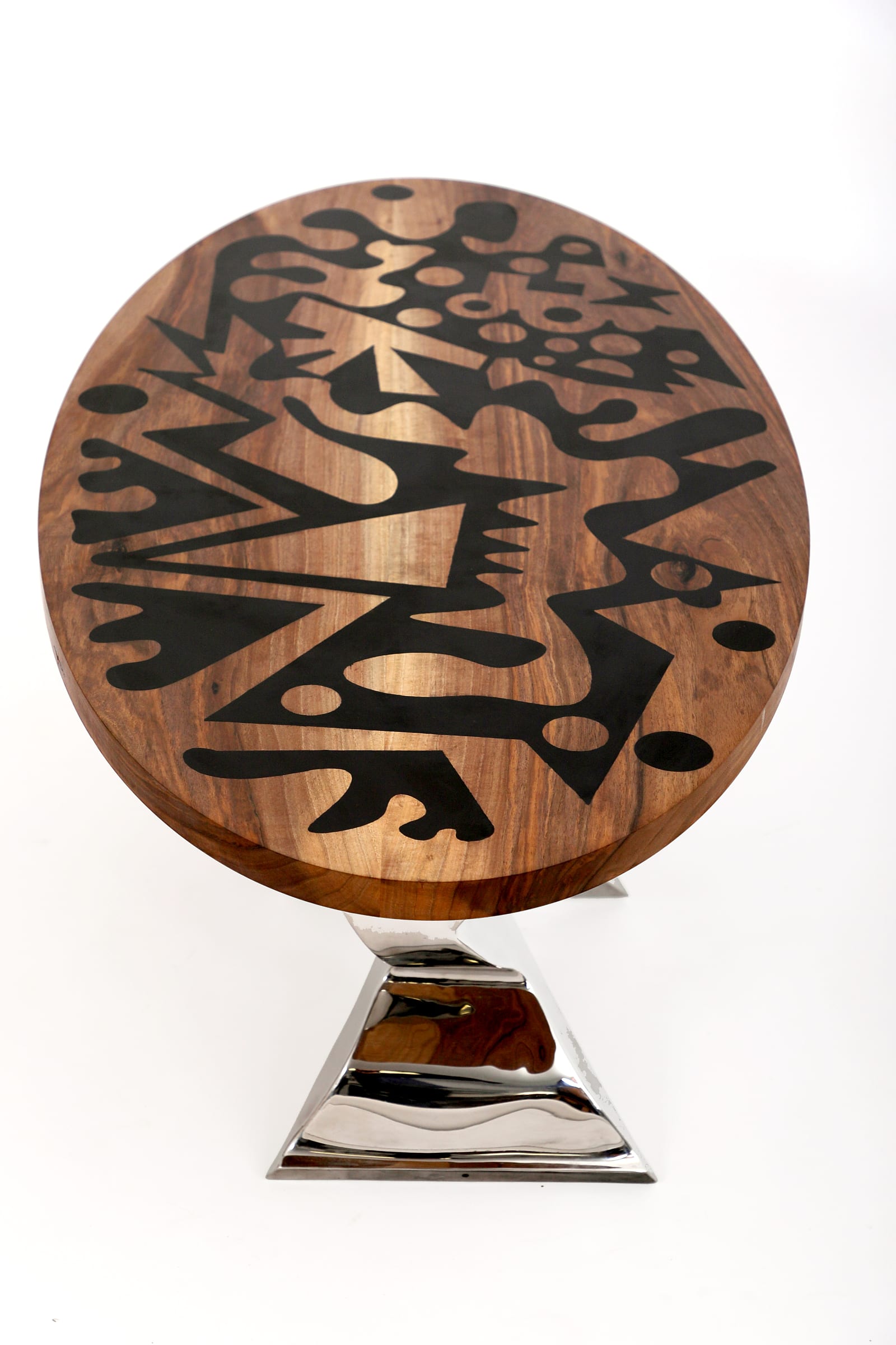 Na tvorbe daného stolíka som spolupracoval s Maťom Šutkom ktorý sa postaral o výrobu dosky. Na doske stolíka z orechového dreva sú vyrezávané ornamenty a následne zaliaté epoxidovou živicou, ktorá je následne pripevnená pomocou nožičiekk stojanu z antikorovej ocele.