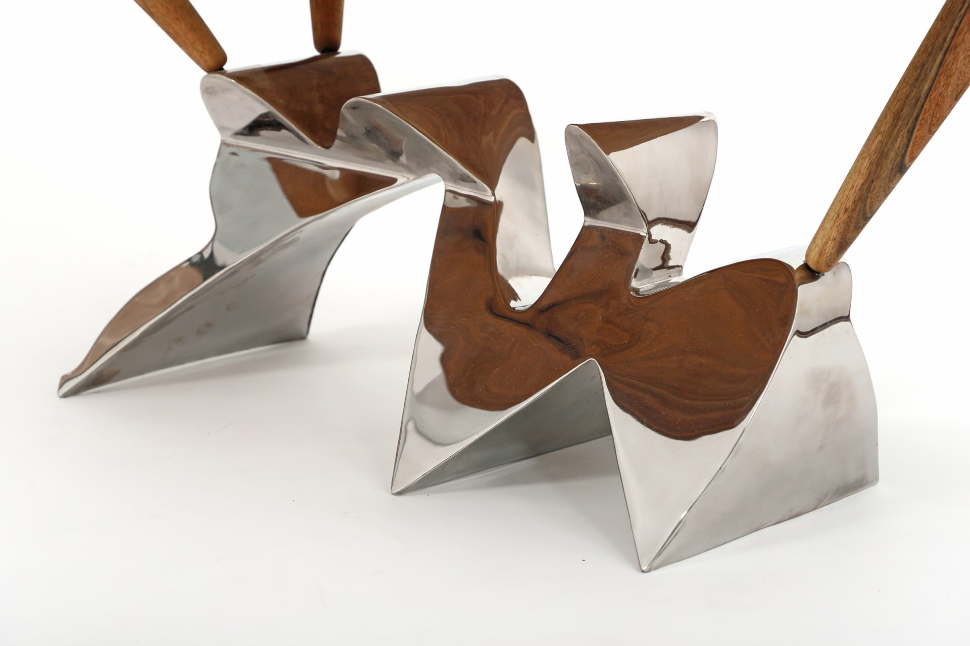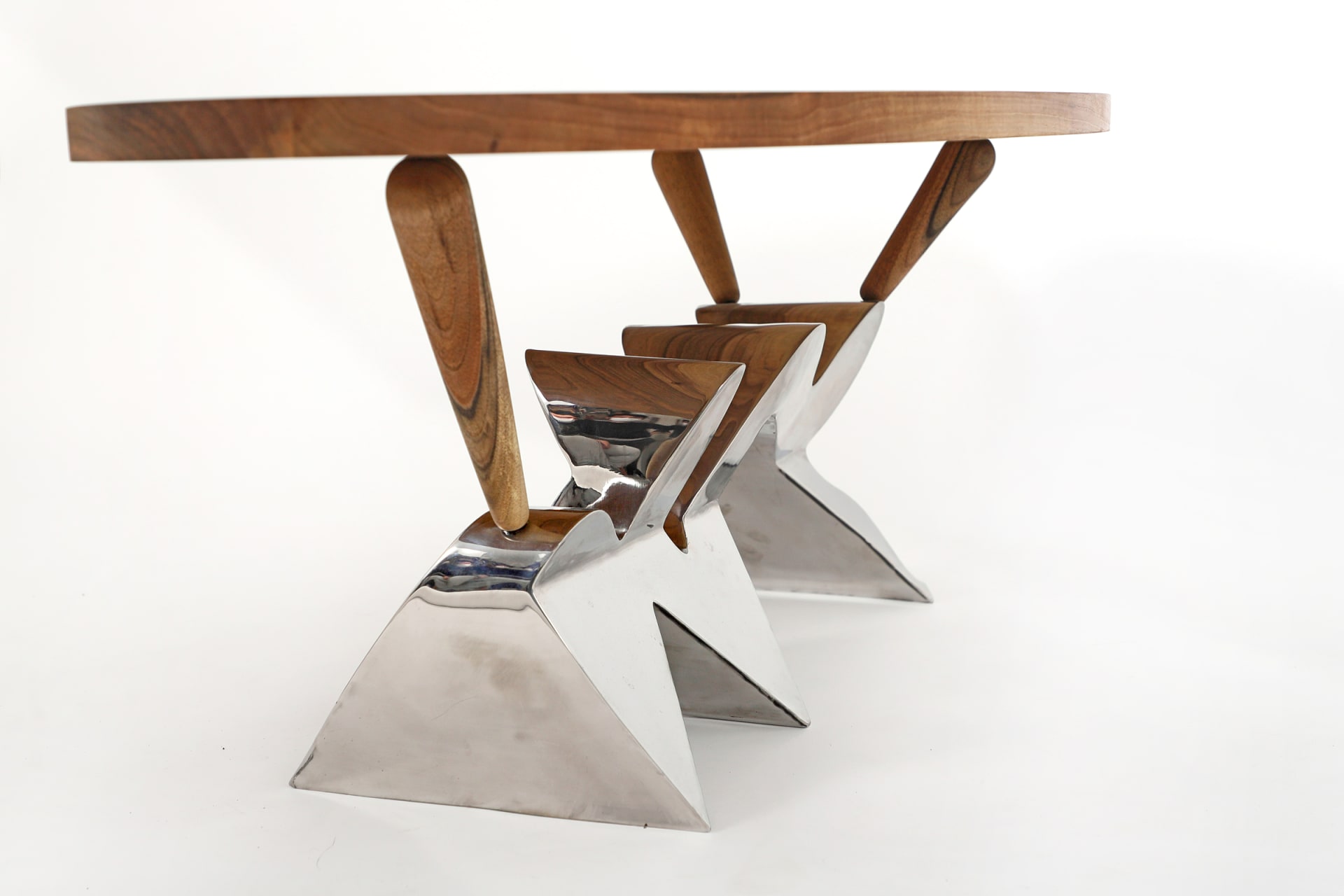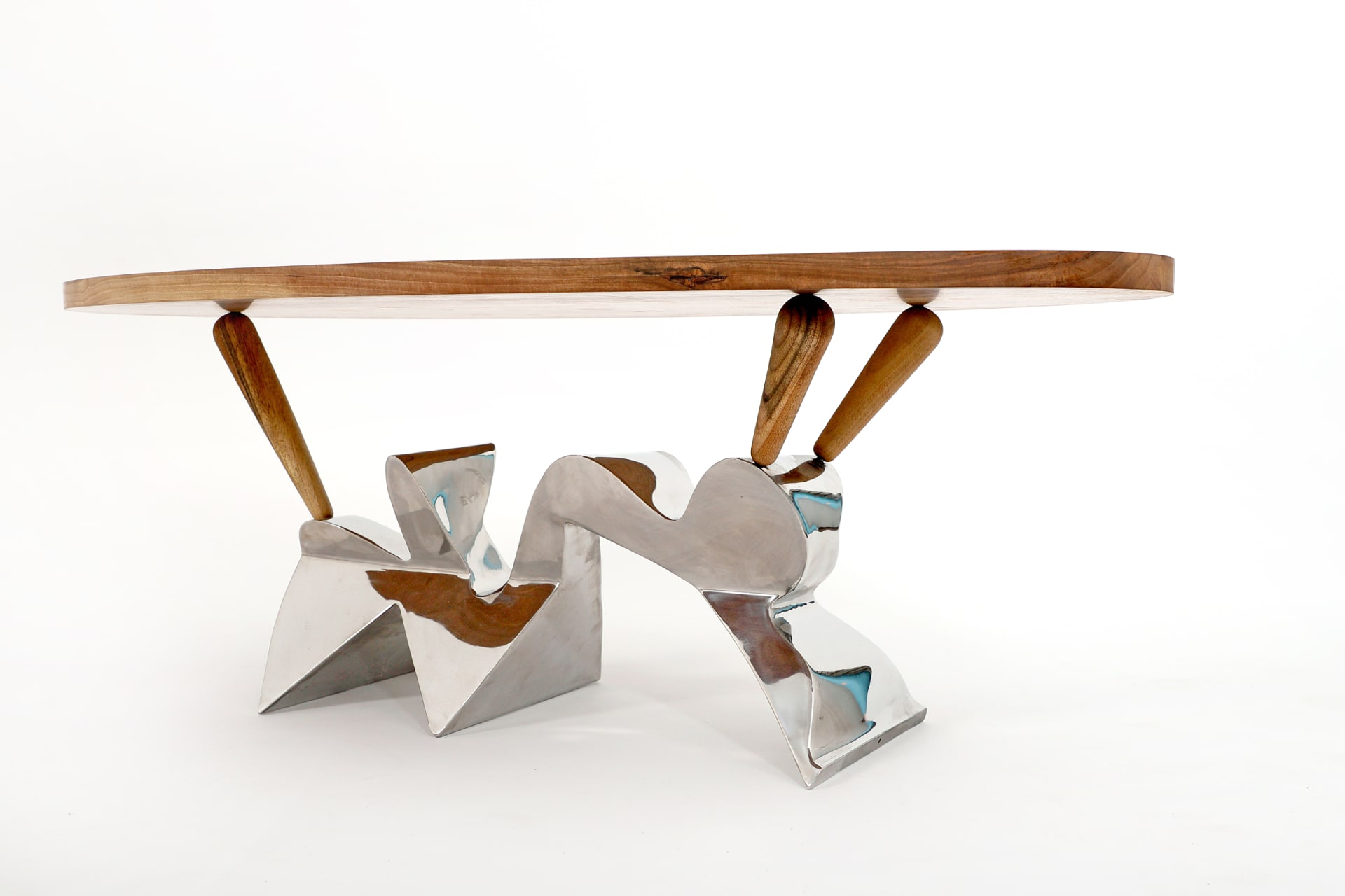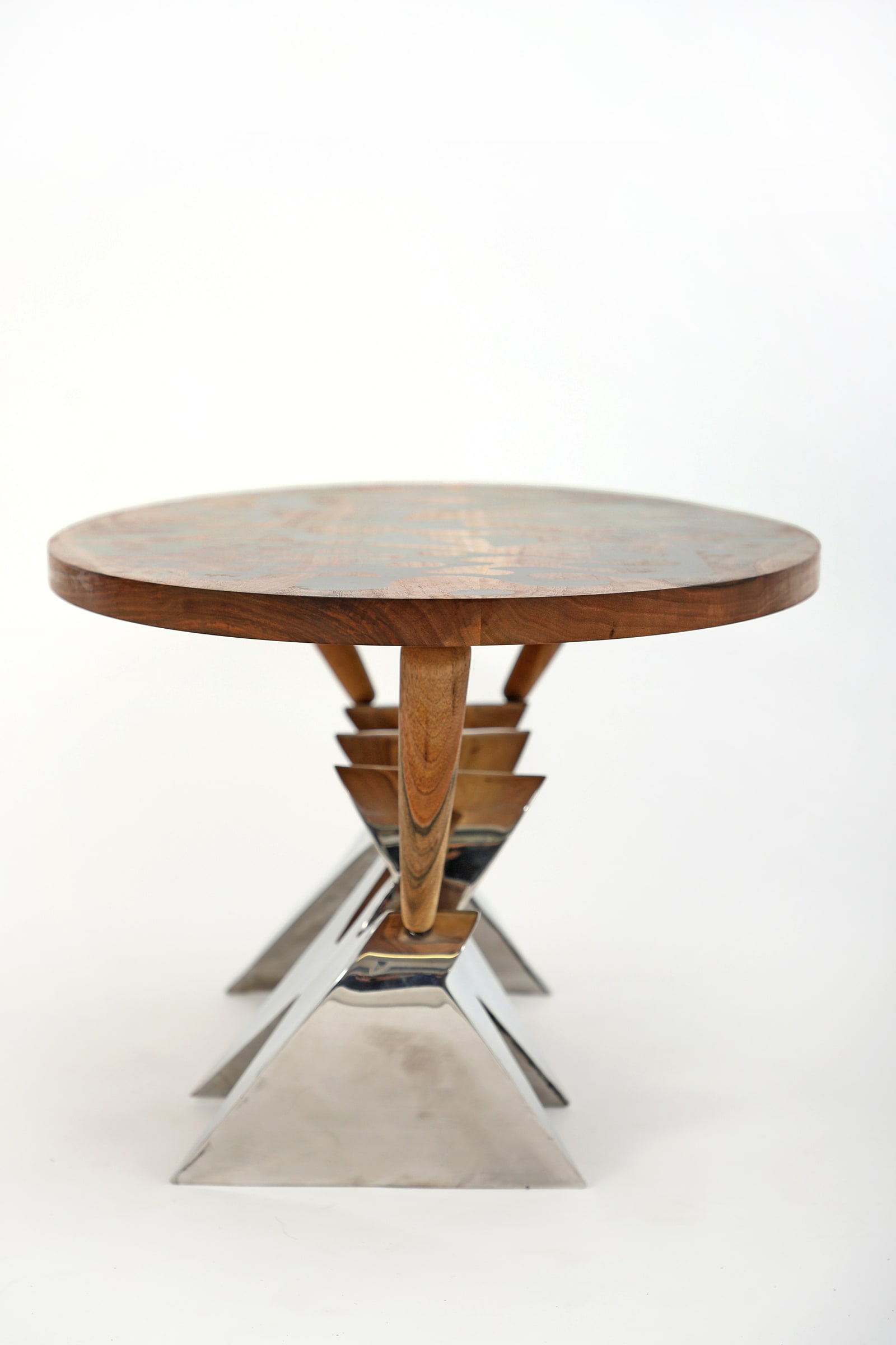 Na tvorbe daného stolíka som spolupracoval s Maťom Šutkom ktorý sa postaral o výrobu dosky. Na doske stolíka z orechového dreva sú vyrezávané ornamenty a následne zaliaté epoxidovou živicou, ktorá je následne pripevnená pomocou nožičiekk stojanu z antikorovej ocele.