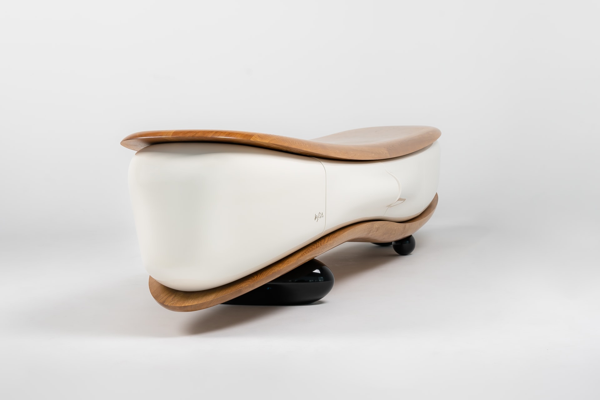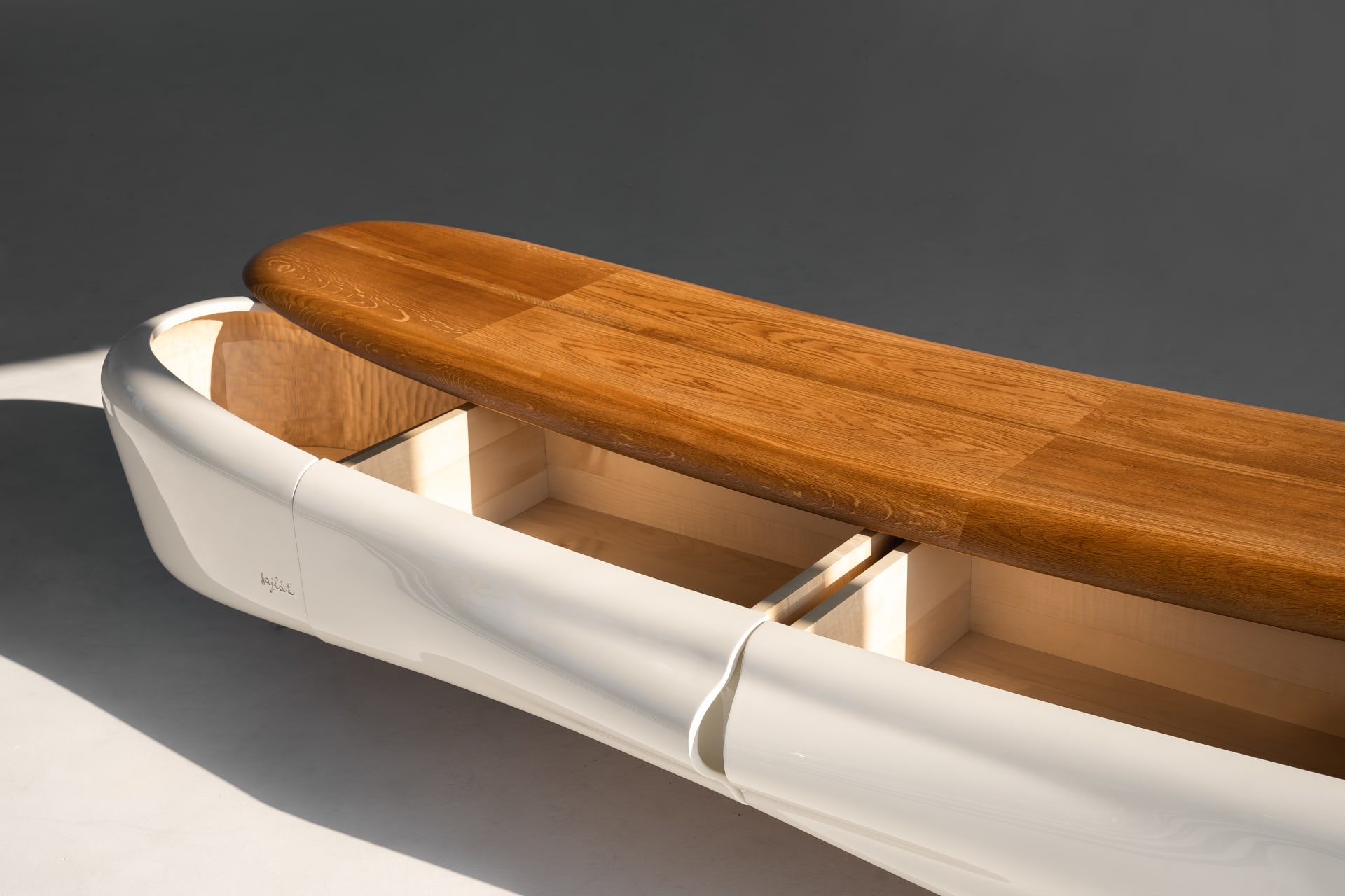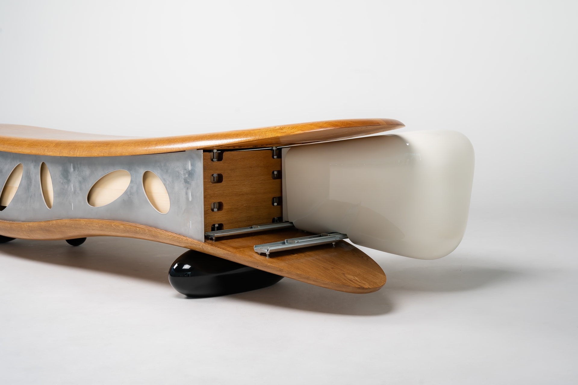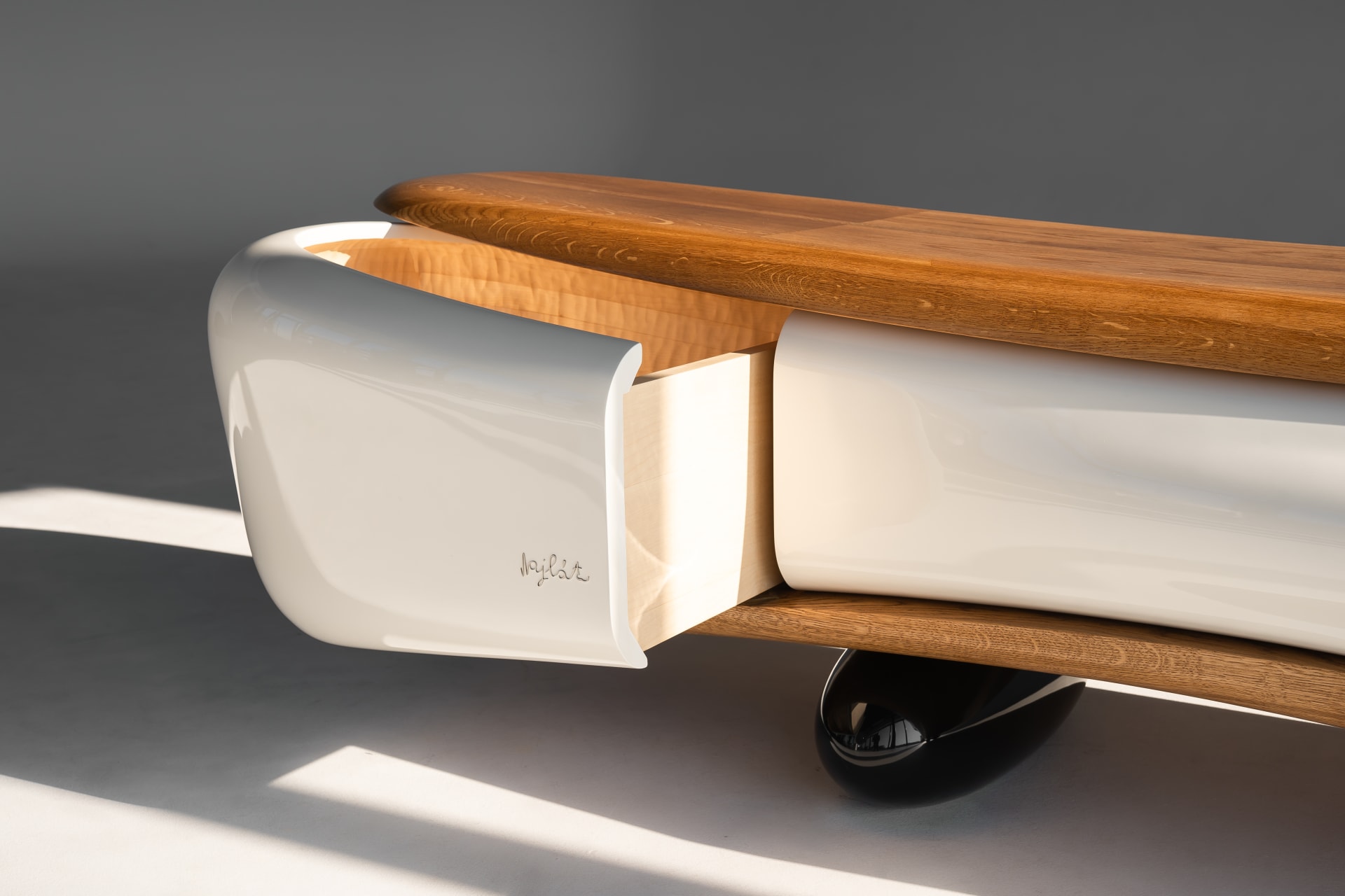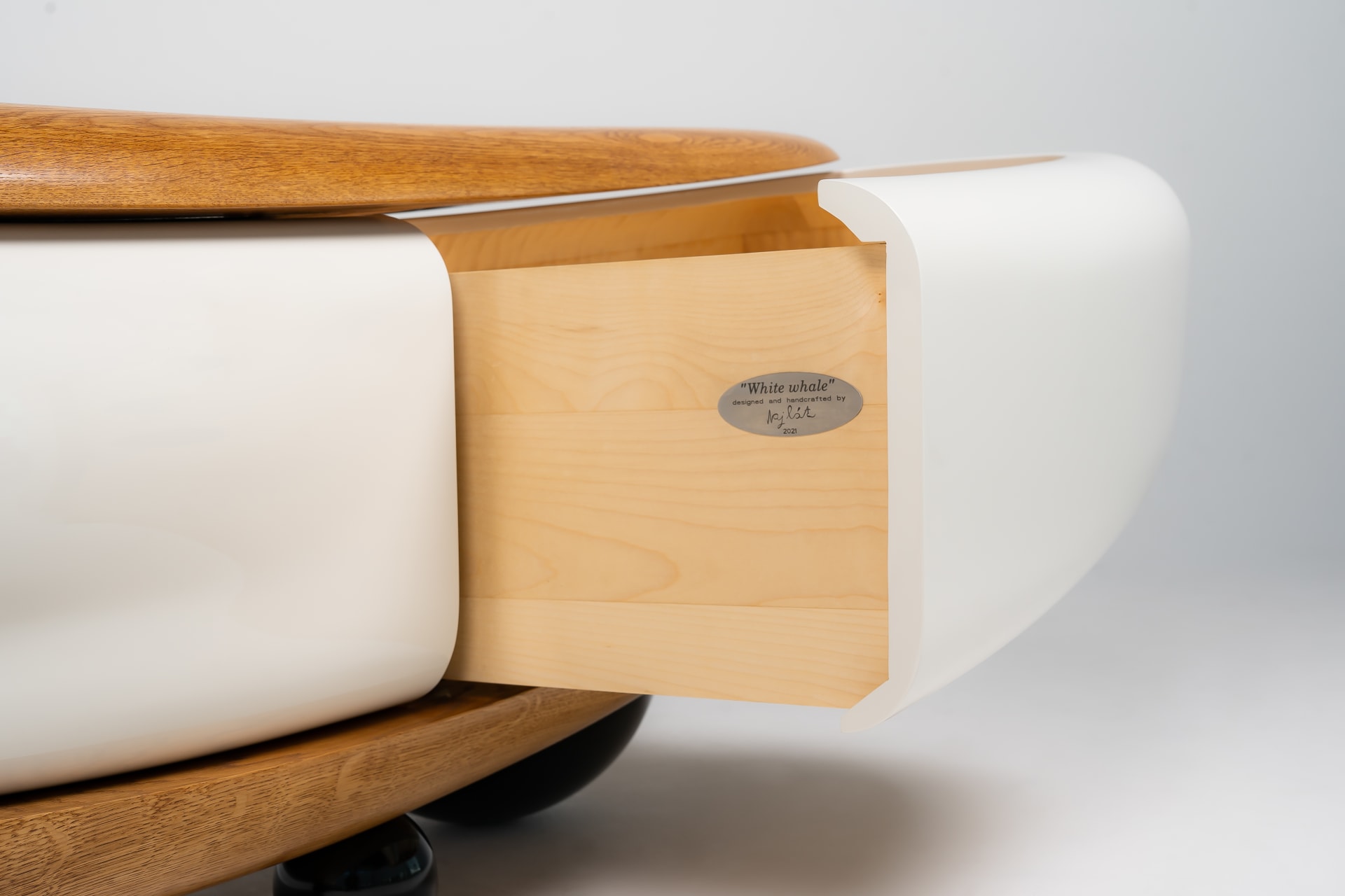 Ustrednou myšlienkou bolo vytvoriť niečo, čo by na prvý pohľad nevyzeralo ako to, čím to je. Vznikla skrinka kde žiadna z vonkajších plôch nie je rovinou. Každý z elementov má určitý typ zakrivenia. Záležalo mi na tom, aby všetky tieto tvary boli postupne opracované ručne, tradičnými postupmi a tradičnými nástrojmi. Na konštrukciu korpusu skrinky som zvolil európsky dub, šuflíky sú z javorového dreva a vonkajší povrch šuflíkov pozostáva z viacerích ručne brúsených vrstiev tmelov s hlavnou vrstvou z leštenej polyuretánovej farby. Vnútorné tvary postranných šuflíkov majú výraznú štruktúru vďaka ručnému opracovaniu rezbárskymi dlátami. Pre zachovanie hlavnej myšlienky sú nohy taktiež oblých tvarov pričom eliptická noha je sústružená z čerešňového dreva a nohy guľového tvaru sú zvárané z ocele. Povrchy sú taktiež z polyuretánovej farby. Pre celý koncept bolo nutné aby všetky mechanizmy výsuvov šuplíkov boli skryté a preto sú navrhnuté zo spodnej strany šuflíkov. Ostatné súčasti skrinky sú z hliníka ( zadná stena ) a antikorovej ocele ( spojovacie prvky ). Celý proces realizácie od návrhu po konečné zladenie šuflíkov trvalo vyše roka a viac ako 1000 Hod. Skrinka “ Biela veľryba” je a vždy bude vyrobená len jedna.